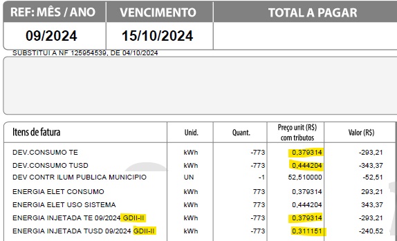 II. Agora vamos supor que você gastou 900 KW/h, porém a taxa sobre o FIO B o valor do KW consumido é maior do que do KW injetado, supondo o valor do KW Consumido foi de R$ 0,823518 e o valor do KW Injetado foi de R$ 0,690465, então o consumo foi de 900 KW x R$ 0,823518 então o valor do consumo será de R$ 741,16 e o Injetado foi 900 x R$ 0,690465, o valor da energia injetada será de R$ 621,4185. Como o valor do KW não é 1 para 1, ou seja, o valor do KW consumido é maior do que o valor do KW Injetado. Nesta situação acima a diferença de valor entre o KW Consumido subtraindo o KW Injetado foi de R$ 119,74.