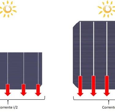 Com a metade da corrente circulando em cada célula, as perdas ôhmicas nos terminais e contatos elétricos e nas próprias células são reduzidas a 1/4 das perdas originais, pois a perda ôhmica do módulo torna-se P = R (i/2)2 = Ri2/4, ao passo que originalmente as perdas seriam P = Ri2, assumindo que as resistências ôhmicas presentes nos módulos são aproximadamente as mesmas para os dois tipos de células.